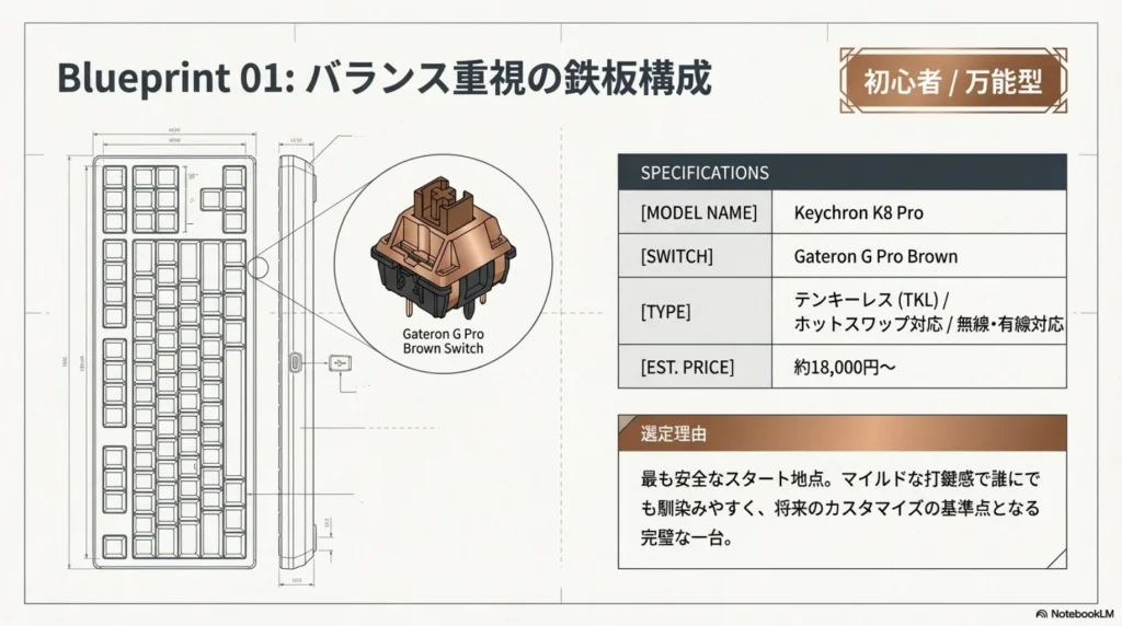 選択肢が多すぎて決められない場合、ホットスワップ対応のキーボードに「Gateron G Pro Brown」スイッチを搭載するのが最も安全なスタートです。